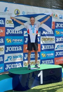 He moved up another gear on turning 65 in September 2023. Again accompanied by Beth they travelled to Pescara in Italy for the European Masters Athletics Championships. Incredibly in the space of 11 days Colin amassed 4 gold medals in the 10000M track, 8K XC, 10K road and half marathon events. He did not rest on his laurels and a few weeks later at the age of 66 he captured the Scottish M60 4K XC title. The following week he lined up on home territory at Tollcross Park to contest the British and Irish Masters XC Championships. After the initial downhill cavalry charge he threw down the gauntlet to his M65 rivals to open up a lead on the first climb which he increased to 34 seconds by the finish. A proud Beth and son Paul and partner Jenn were present to witness his M65 individual and Scottish team double victories. He ended up his XC season by clocking the fastest age group time in the BMAF Relay Championships in Leicestershire and helped Cambuslang to team silver medals. Having driven there and back he turned out the following day for the Scottish Masters Track 10000M where he displayed remarkable powers of mental and physical recovery. His time of 37.27.09 broke by 3 seconds the longstanding record held by former Motherwell YMCA, Clyde Valley and latterly Cambuslang athlete Willie Marshall.